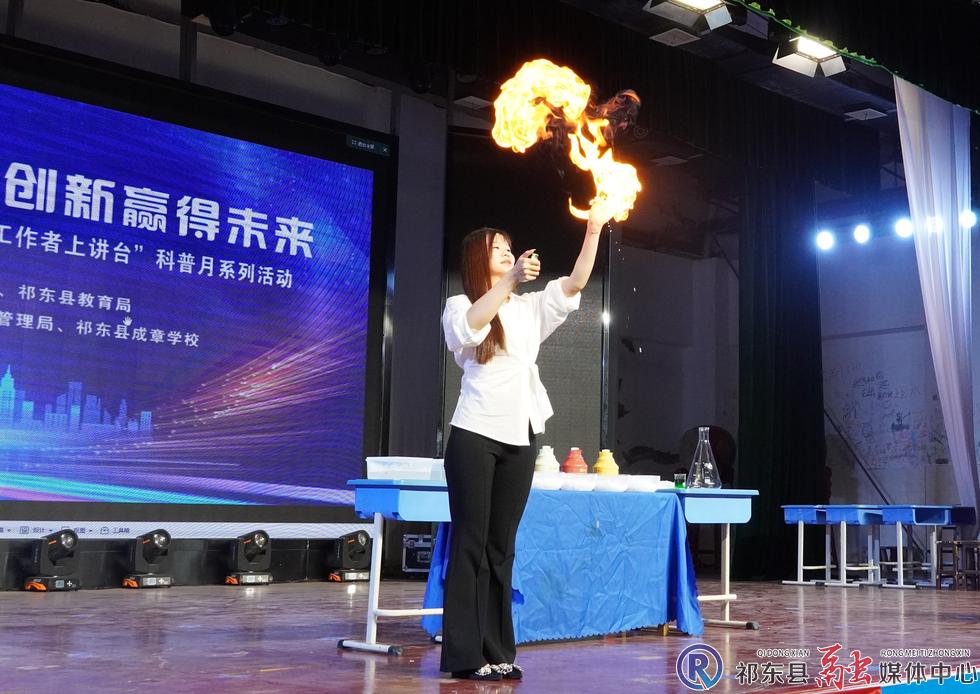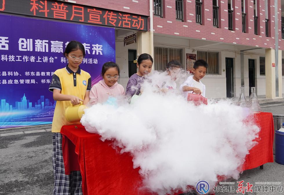 在祁东县石门小学与县成章学校,科技服务志愿者表演了《哪吒健身运动操》,活泼的节奏点燃学生们的参与热情。衡阳科学社团带来的科学实验秀惊艳全场,"大象牙膏""液氮云雾""火焰掌"等趣味实验接连呈现,干冰、液氮展现的奇妙科学现象让学生们目不转睛,发出阵阵惊叹。